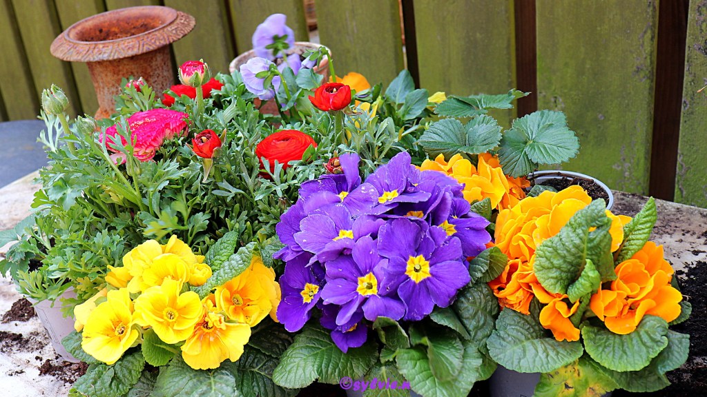Diese Frühlingsblumen warten darauf, dass ich sie einpflanze.
