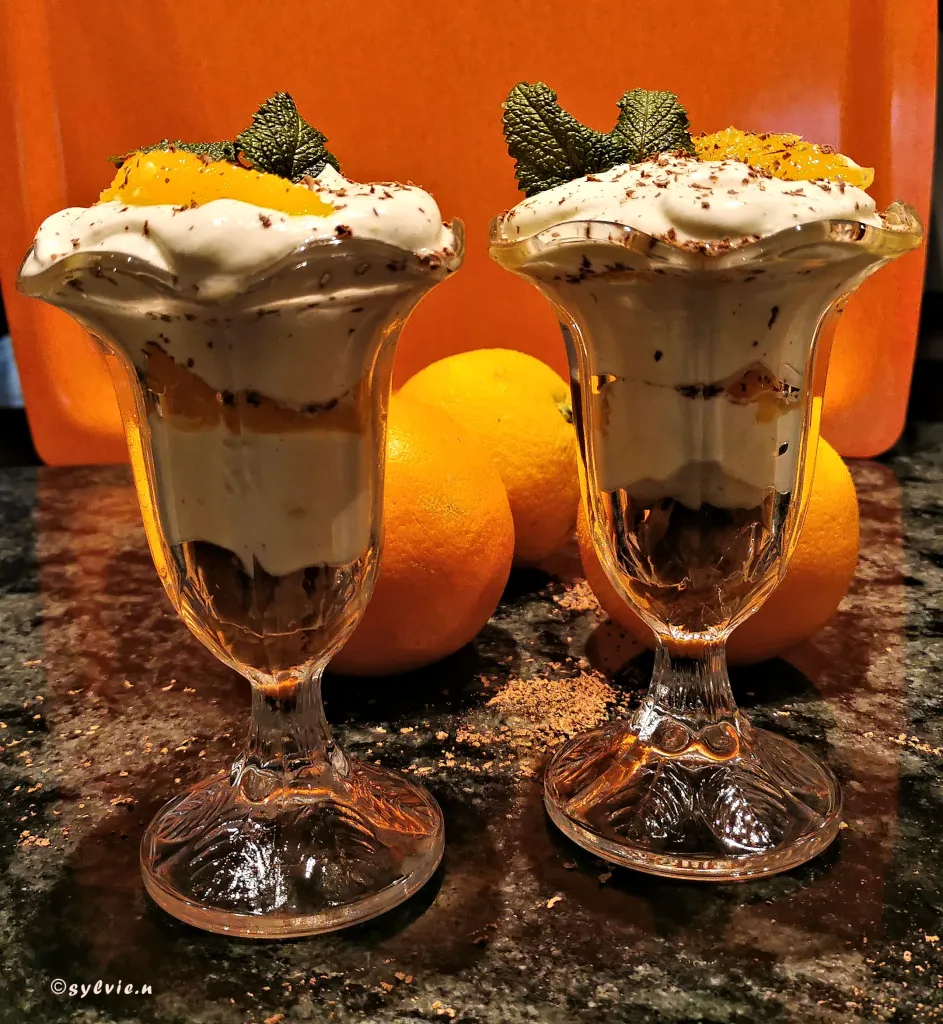 Etwas von der Sahne-Quark-Masse auf die Haferkekse geben. Dann einige halbierte Orangenspalten dazugeben. Auf die Orangenspalten etwas geriebene Blockschokolade streuen. Dann den Vorgang wiederholen, bis das Glas gut gefüllt ist. Zum Abschluss noch ein oder zwei Orangenspalten und Blockschokolade draufgeben. Und wenn noch Platz ist etwas Orangenlikör auf den Triffle geben. Bei mir ist das Glas etwas zu voll geworden. Da passte kein Likör mehr drauf. Mit Zitronenmelisse dekorieren.
