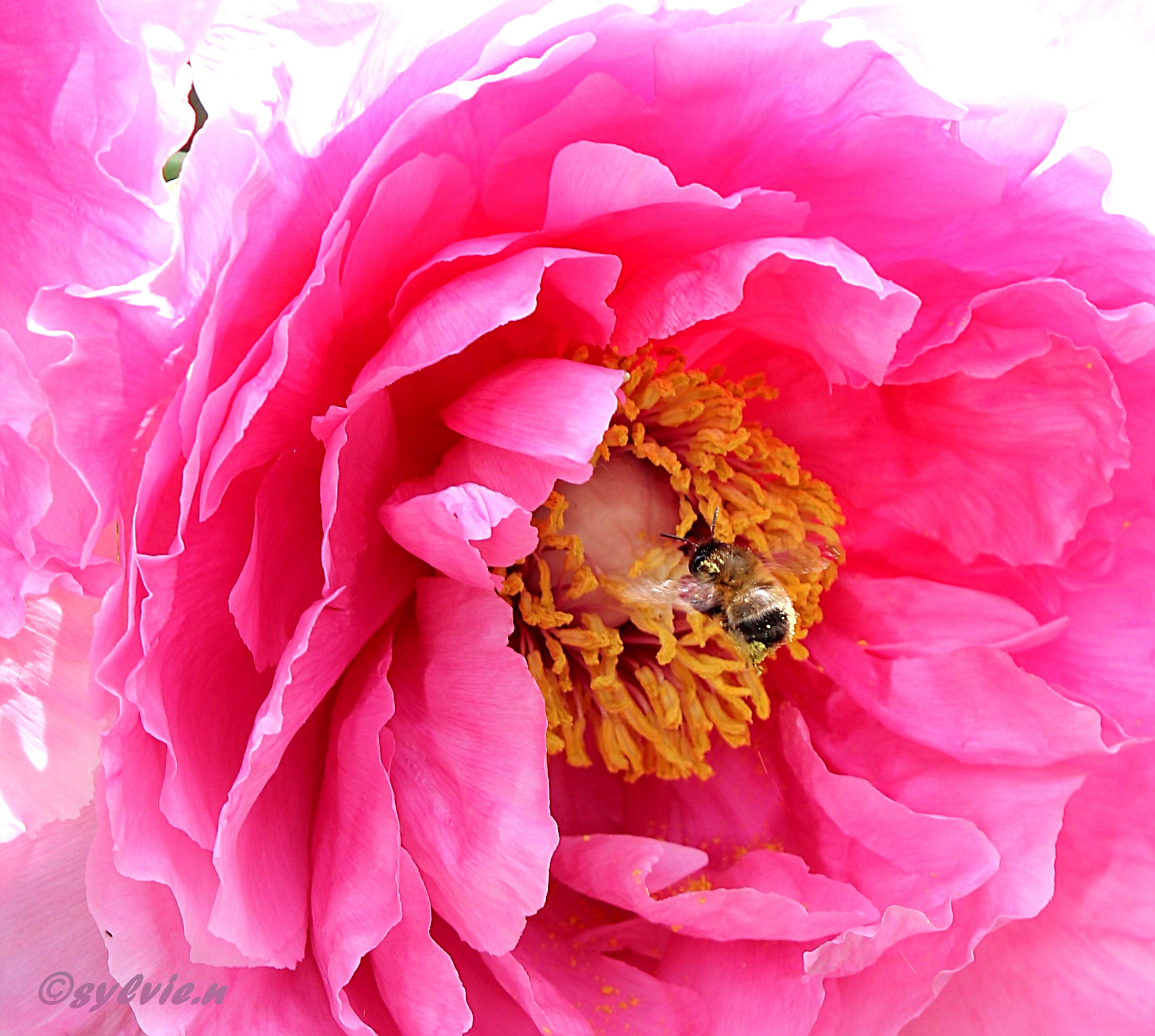 Die Pfingstrosen sind jetzt so weit geöffnet, dass sie Besuch von den Bienen bekommen. Es ist ein Blütenstaubparadies für Bienen.